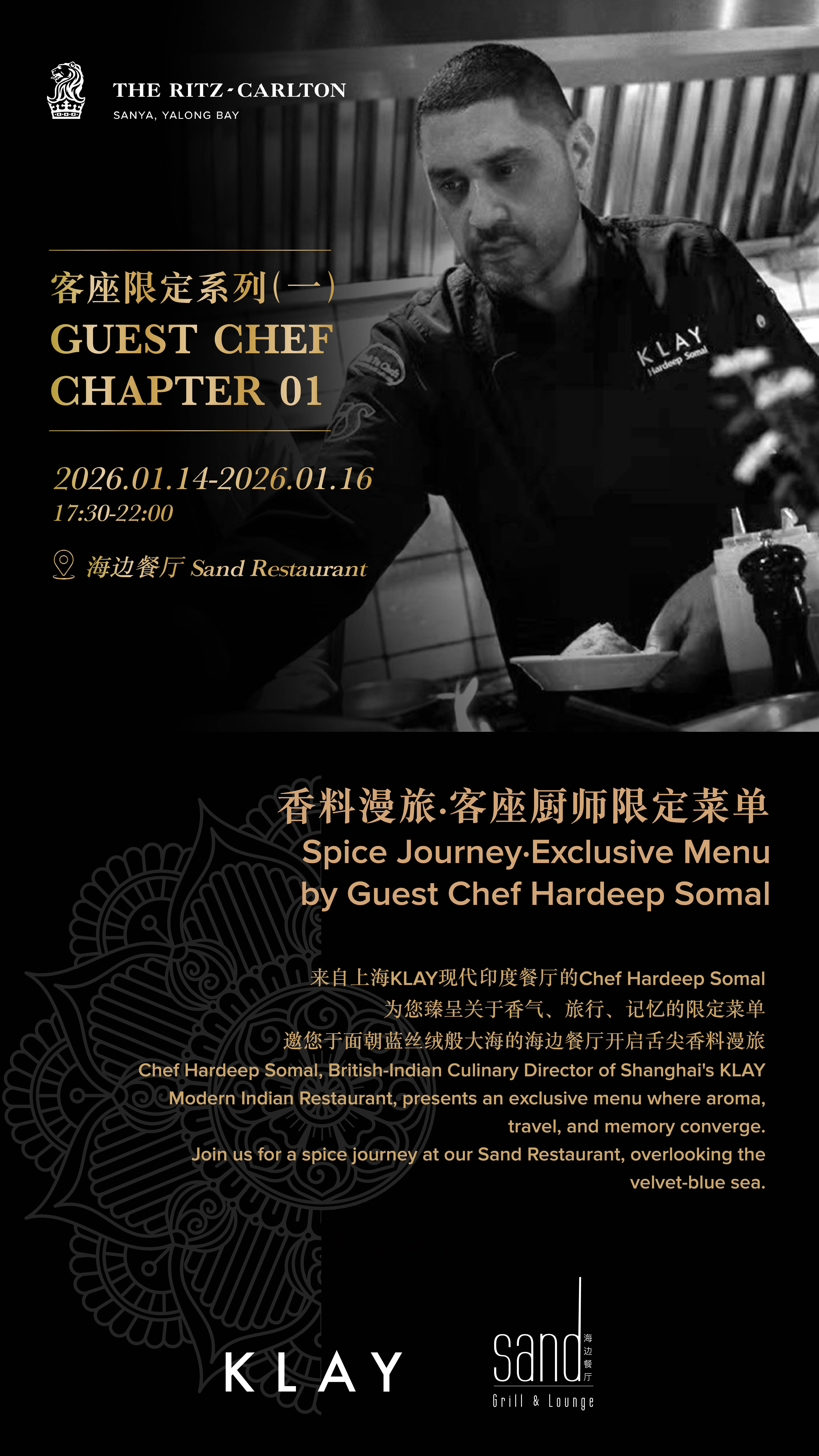 2026年1月14日至1月16日,来自上海备受赞誉的现代印度餐厅KLAY的客座主厨Hardeep Somal,将莅临金茂三亚亚龙湾丽思卡尔顿酒店的海边餐厅,以为期三日的限定印度菜菜单,展开一场大胆、优雅且充满表现力的风味叙事。