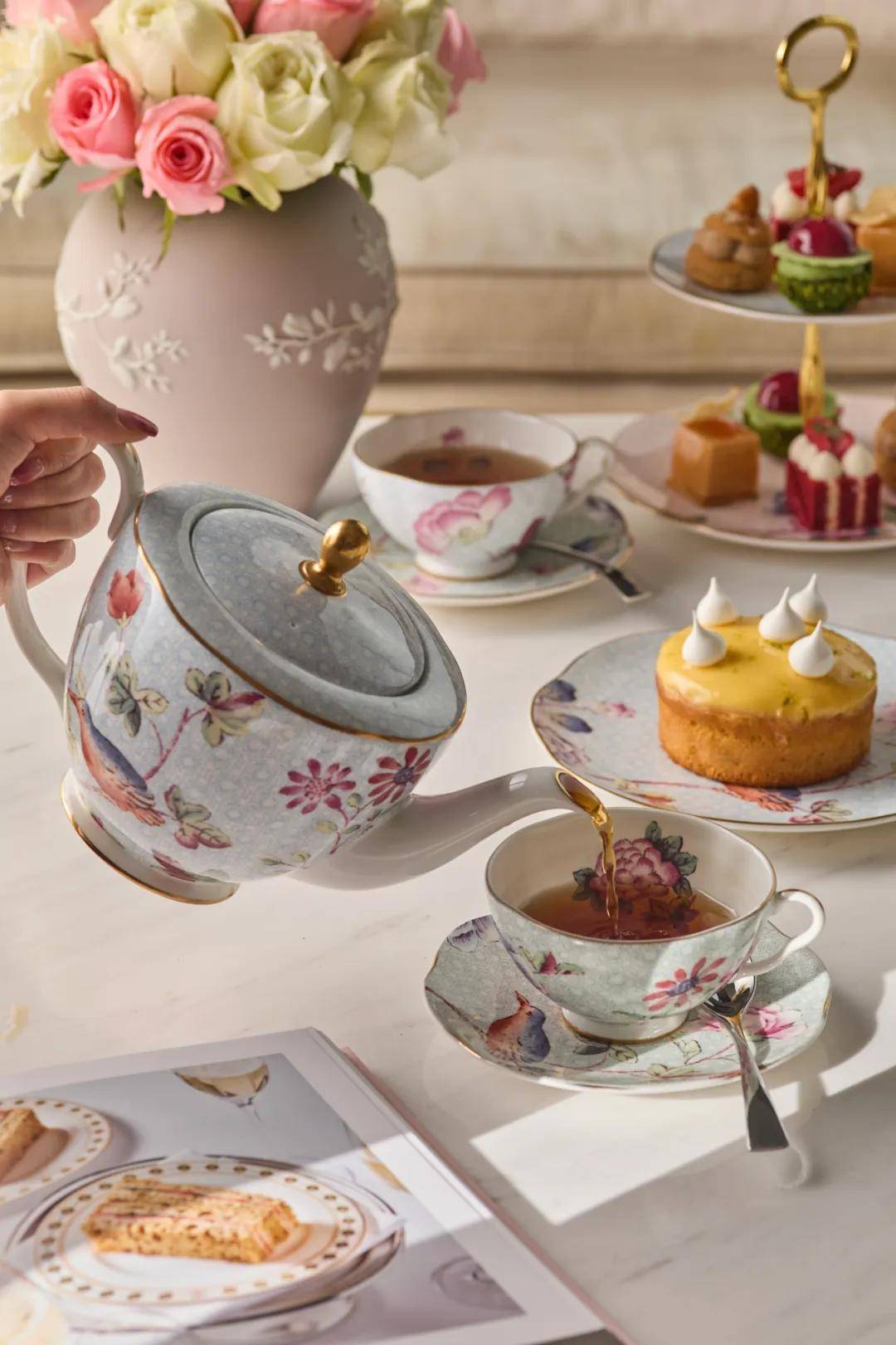 此番「花间绮丽」主题下午茶,既是两大百年品牌的再度携手,亦是一场东西美学的诗意对话。WEDGWOOD「杜鹃」系列茶具,以22K金手工勾边,杯身点缀粉彩渲染花鸟纹样,牡丹杯口柔婉舒展,杜鹃姿态栩栩如生,寓意爱与恒久,为春日茶席平添浪漫雅韵。