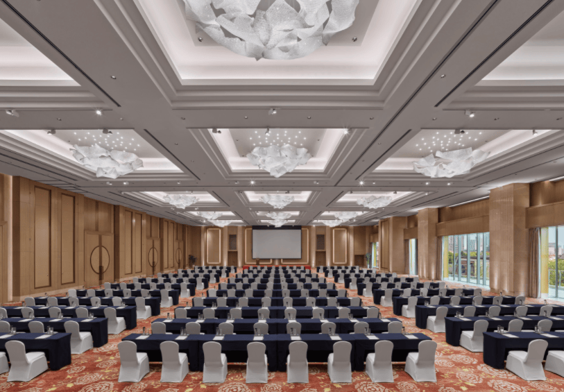 酒店大宴会厅以1380平方米的无柱开阔空间,配以挑高设计,可轻松容纳千人盛宴,犹如一幅徐徐展开的巨幅画卷,融合先进影音系统与灵活璀璨灯光布局,营造沉浸式感官体验,为各类活动提供兼具气度与美感的理想场域。
